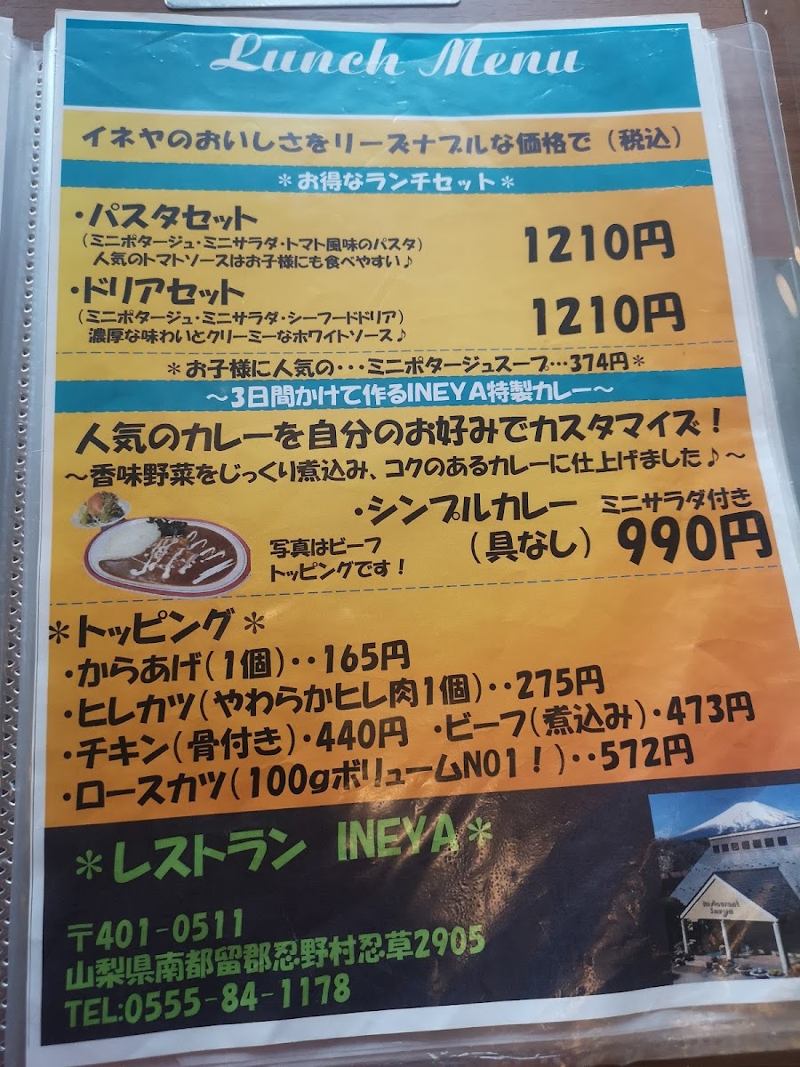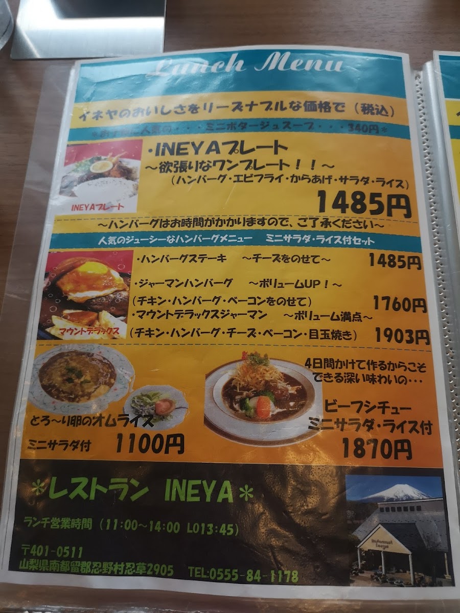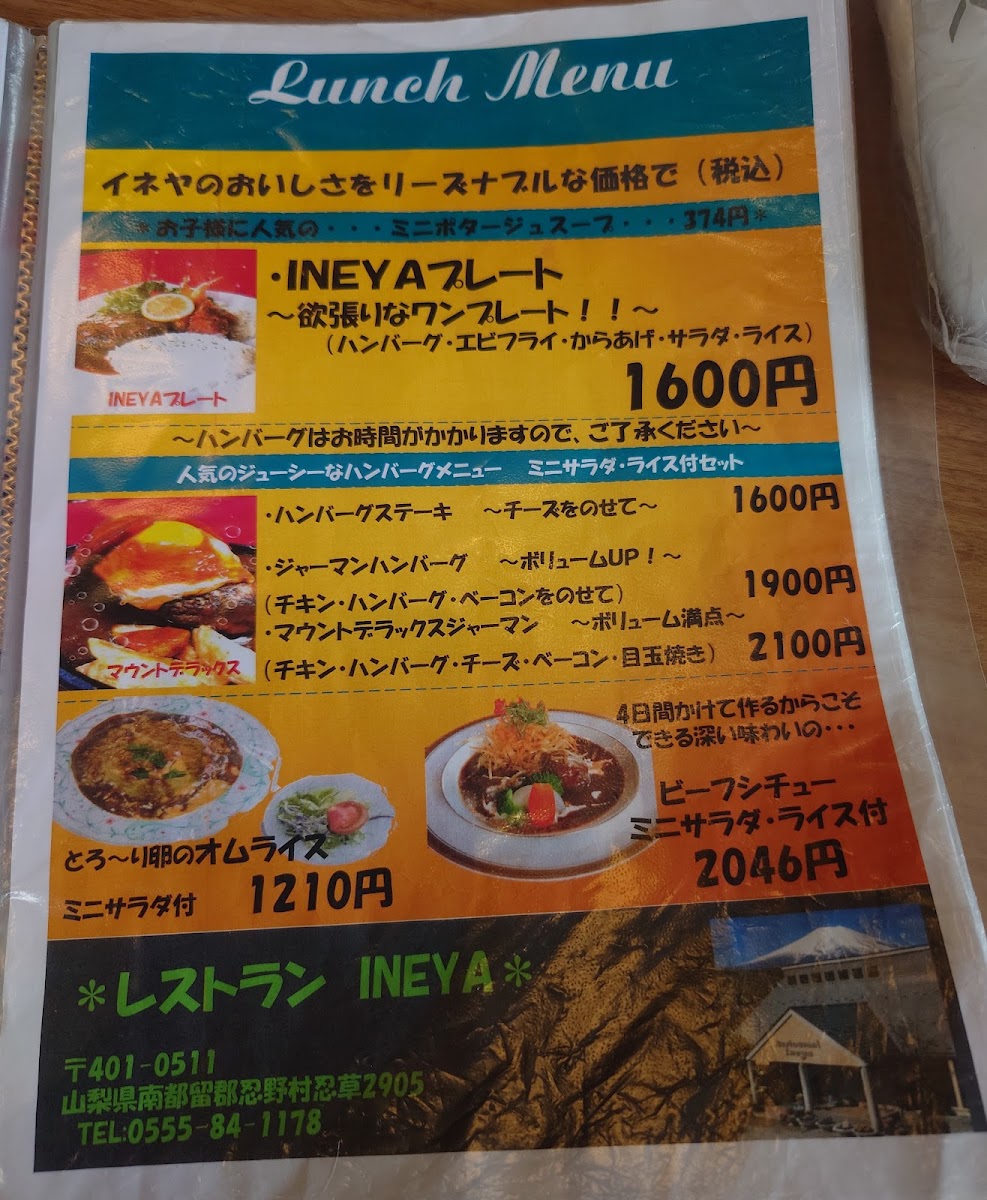 Welcome to Restaurant Ineya, a hidden gem in the heart of Oshino, Yamanashi. This mid-economy dining spot offers a delightful array of homey dishes at surprisingly reasonable prices. Guests rave about the vibrant flavors and care in preparation, with standouts like the exceptional hamburger steak and the savory curry catching attention.